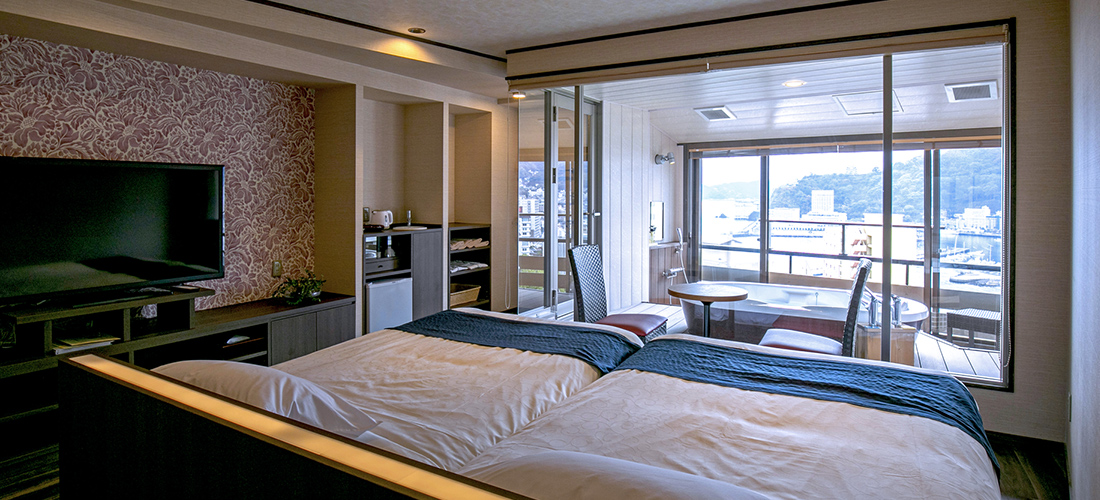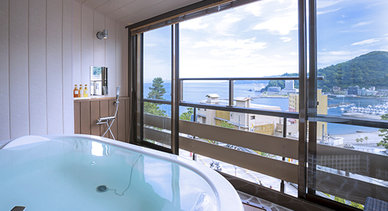 お部屋で温泉が楽しめるワンランク上の洋室タイプのお部屋です。熱海の街並みを望むバスタブには源泉から引いた100%の温泉が供給されています。常時かけ流しではなくお好きな時にお湯を張っていただくスタイルです。熱海の美景を楽しみながら贅沢な湯浴みを満喫できます。