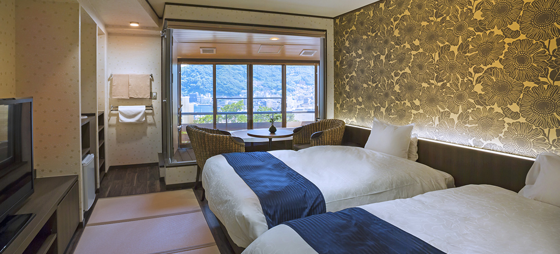客室情報 | 洋室 ツインルーム シモンズ製セミダブルベッド・温泉付ビューバス・シャワー・トイレ(ウォシュレット) |