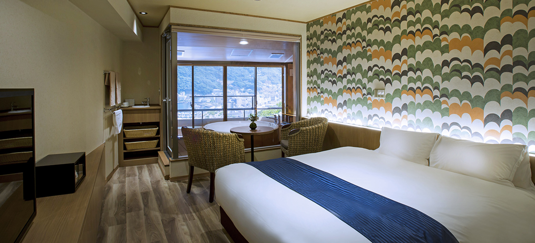客室情報 | 洋室 ダブルルーム シモンズ製クイーンベッド・温泉付ビューバス・シャワー・トイレ(ウォシュレット) |