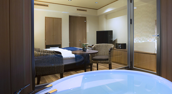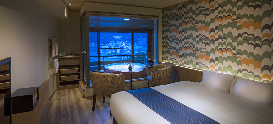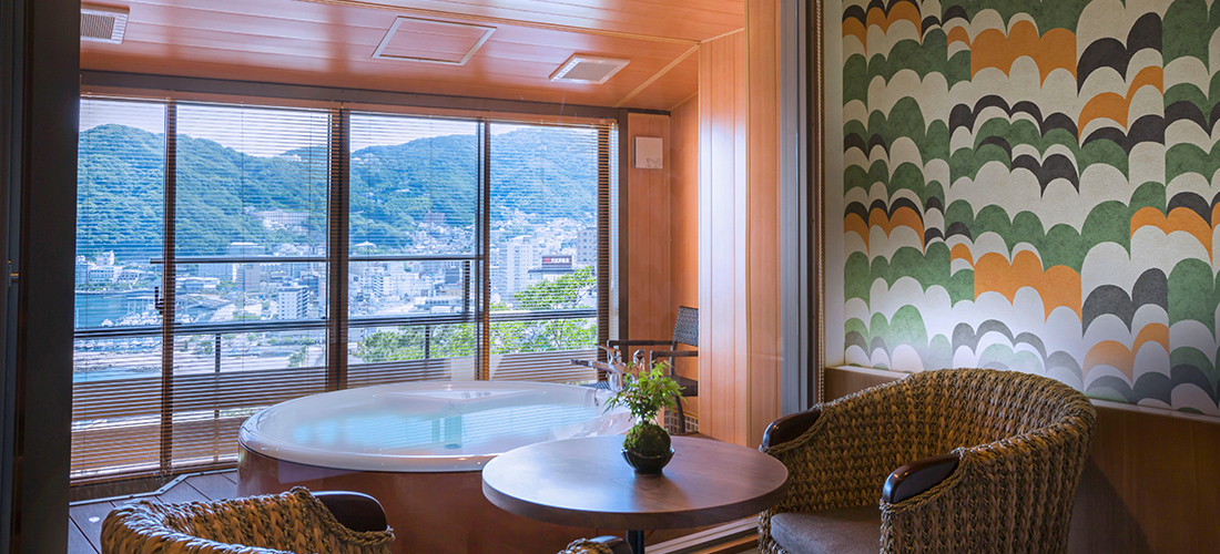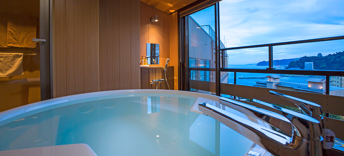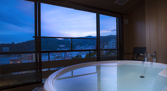 お 部屋で温泉が楽しめるワンランク上の洋室タイプのお部屋です。熱海の街並みを望むバスタブには源泉から引いた100%の温泉が供給されています。常時かけ流しではなくお好きな時にお湯を張っていただくスタイルです。熱海の美景を楽しみながら贅沢な湯浴みを満喫できます。