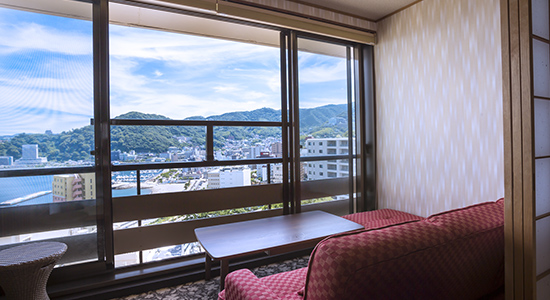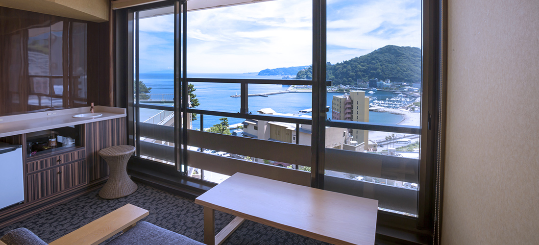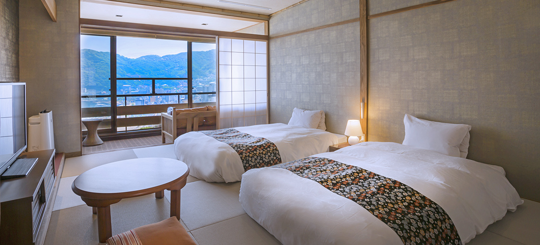 客室情報 | 熱海の街並みが一望のパノラマビュー 和室+広縁+床の間・トイレ(ウォシュレット)・多機能シャワー(ボディーシャワー) |
