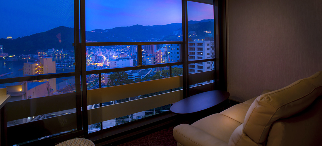 広縁の大きな開放的な窓からは、サンビーチや熱海の街並みを一望でき特に夜景は美しく心奪われます。