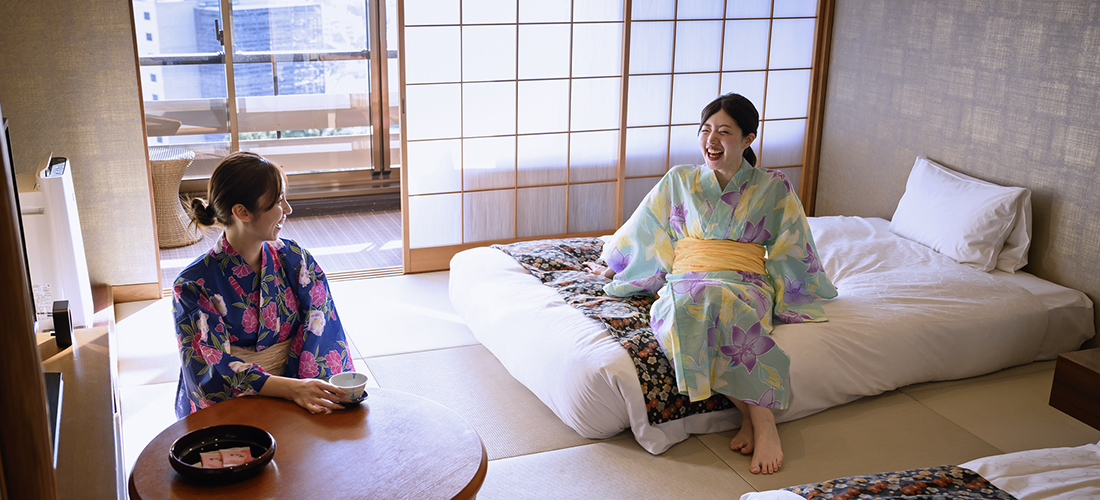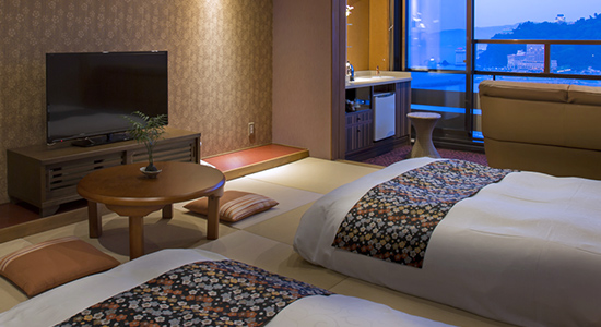 最上階フロアに位置するデラックスルームは熱海の海と街並みが一望できる特別なロケーションのお部屋です。夜はブルーにライトアップされた砂浜、きらびやかな熱海の夜景をお楽しみいただけます。シモンズ社製のベットマットが極上のくつろぎを約束するツインタイプ。伝統的な和室の設えで居心地の良さが好評のお部屋で、カップル・ご夫婦様にご好評いただいております。