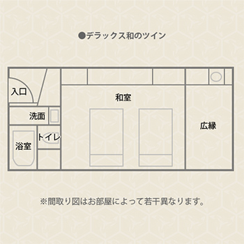 カップル、ご夫婦の快適な滞在のためにデザインされた和のテイストのツインルーム。