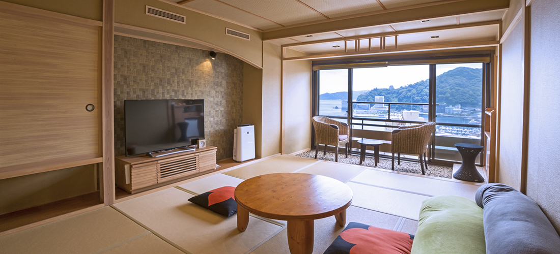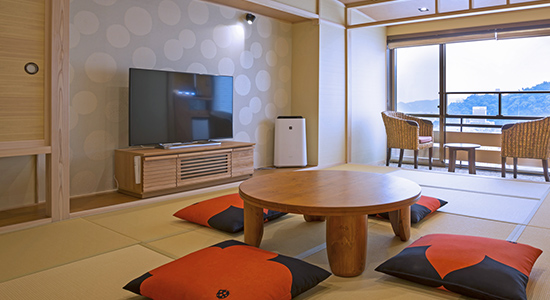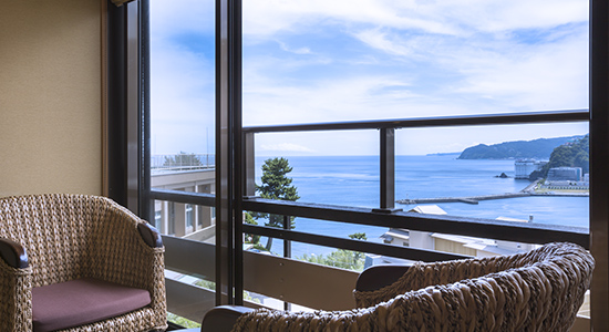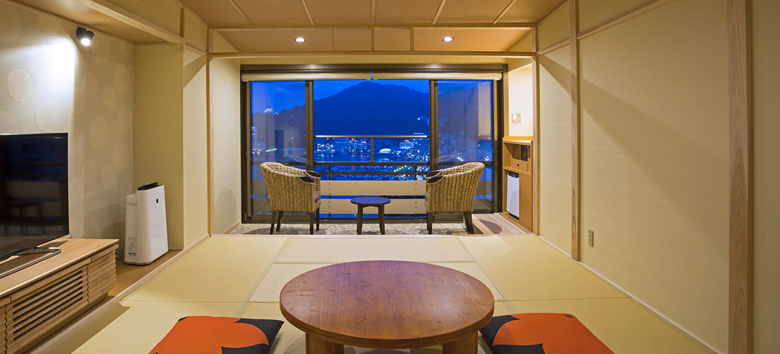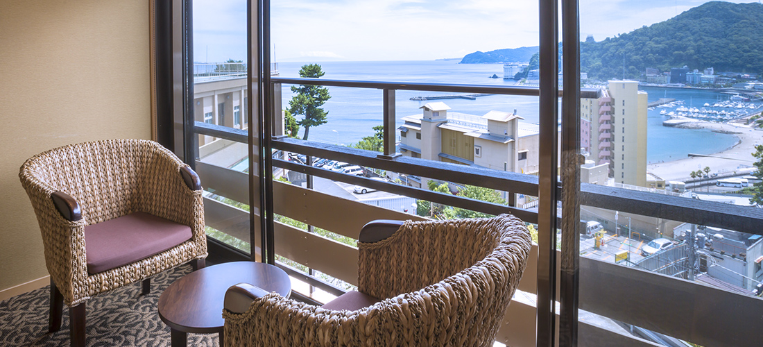 熱海の海と夜景が楽しめるデラックスルーム。12畳と余裕のある間取りと熱海の街並みを望むロケーションの良さが自慢のお部屋です。昼は海、夜は憧れの熱海の夜景、移りゆく熱海の美景をお楽しみください。さらに「ここから動きたくない」と評判のヨギボー「Yogibo」のビーズクッションもご用意。ワンランク上のくつろぎをお楽しみいただけます。