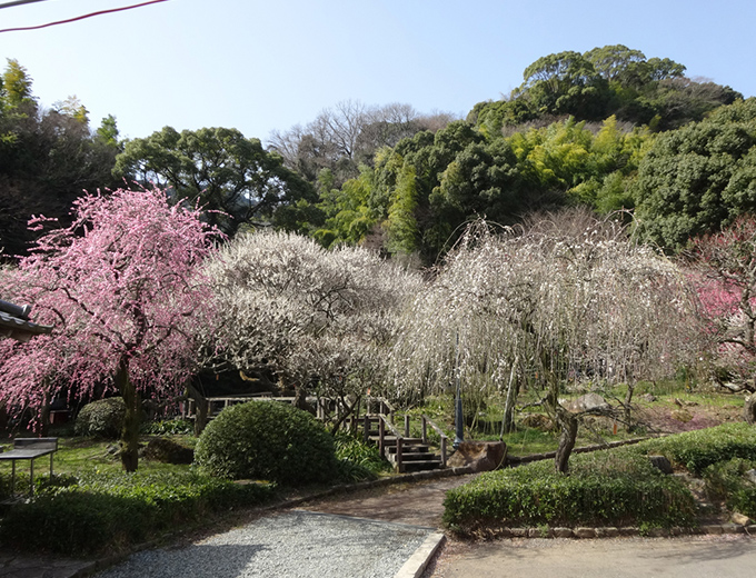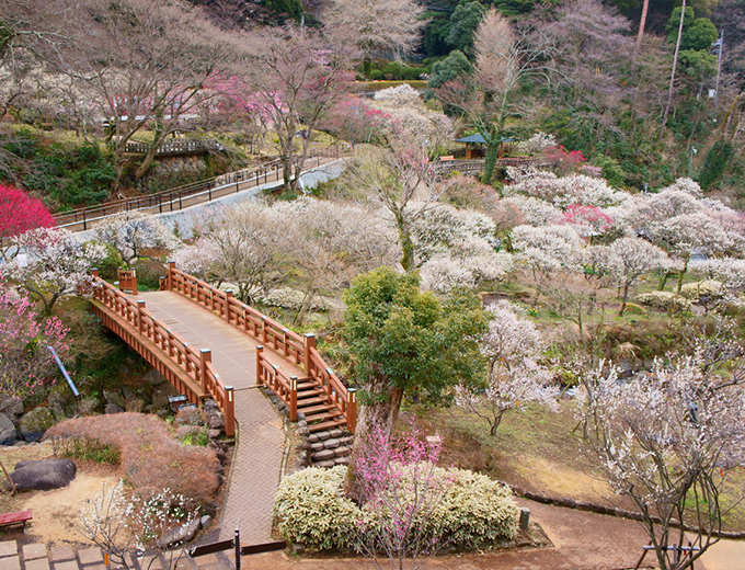 明治19年に開園。樹齢100年を超える梅の古木を含め、730本。12月初めから咲き出し、1月中旬には見頃となります。この頃「梅まつり」が開催され、多彩なイベントが行われます。また、梅園は桜、新緑、紅葉と四季を通じて楽しめます。