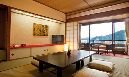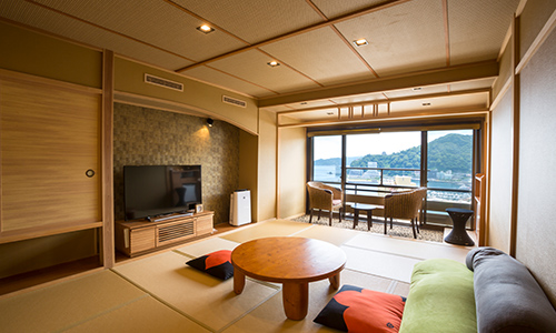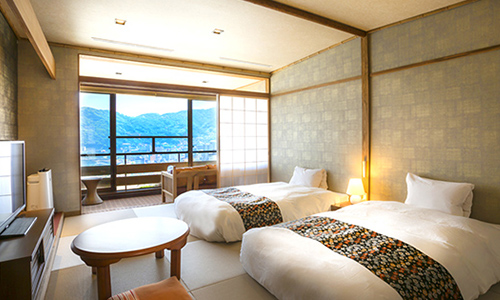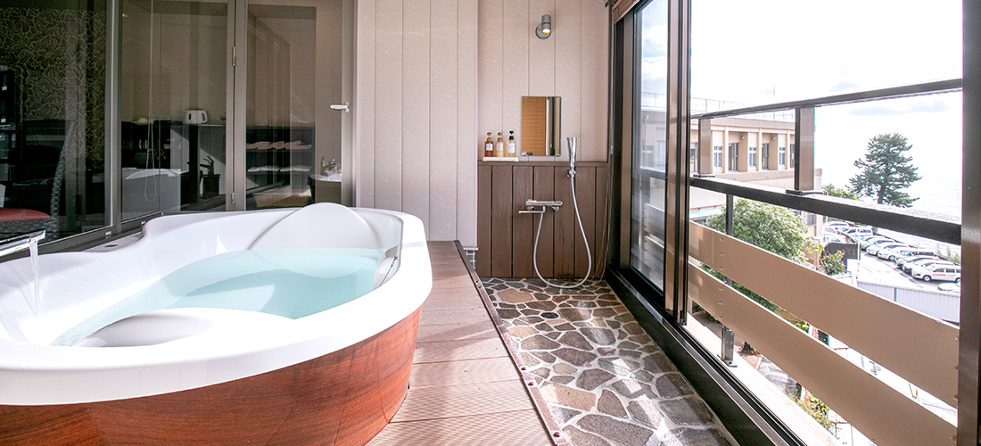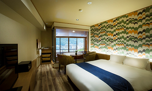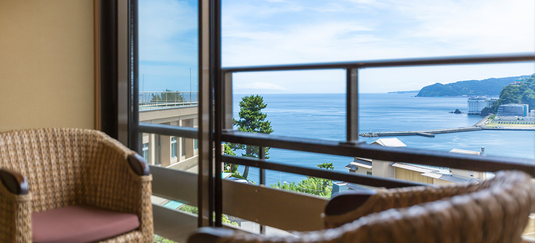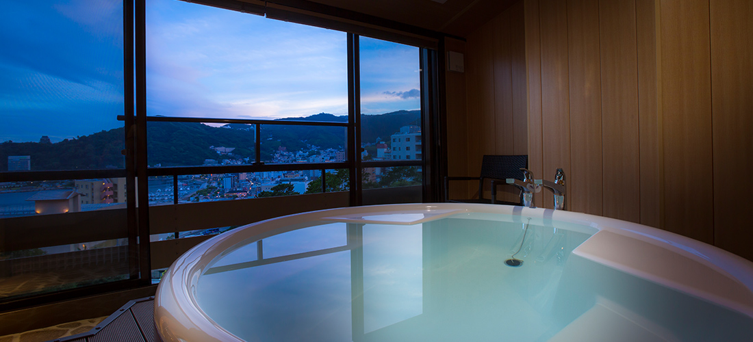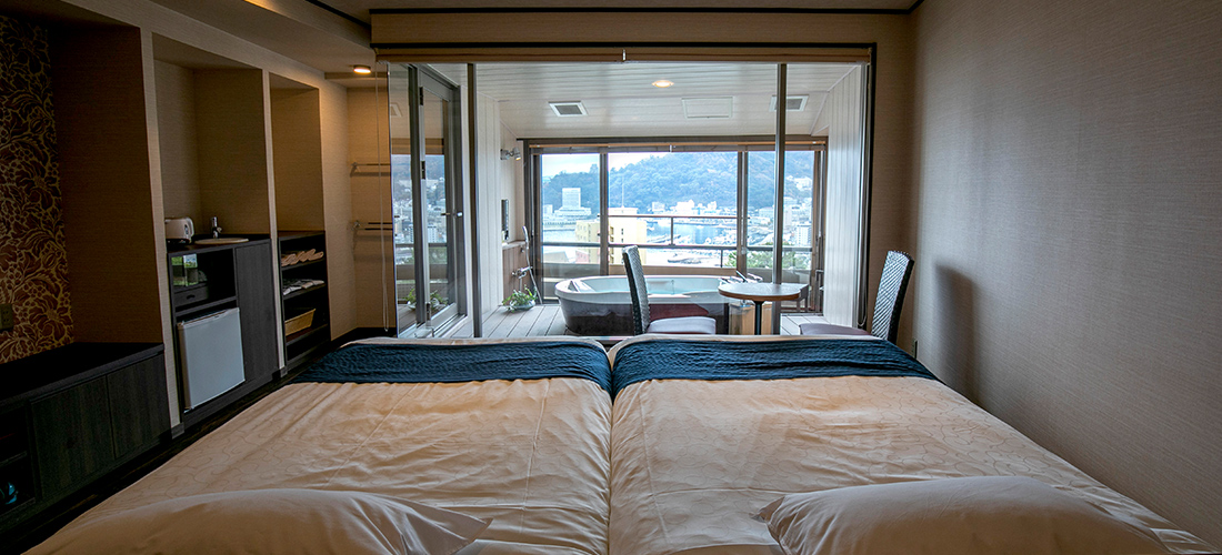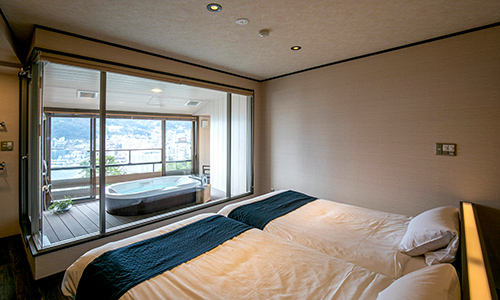 可在房內享受溫泉的高級洋式房型。浴缸引入100%天然泉源,可眺望熱海市景。設有雙人床,適合攜帶小孩同行的家庭入住。