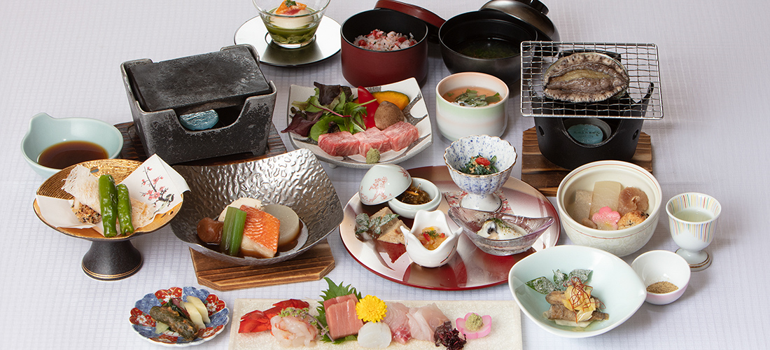 湯宿一番地的懷石料理深受饕客喜愛。熱海擁有豐富食材,從駿河灣、相模灣的新鮮漁獲,到富士山麓嚴選蔬菜與牛肉,四季食材皆由主廚以傳統技藝與細膩巧思精心烹調。另提供伊勢龍蝦刺身、鮑魚炭烤、涮涮鍋等特色料理,並搭配地酒與嚴選葡萄酒。